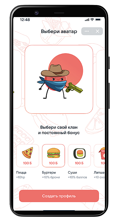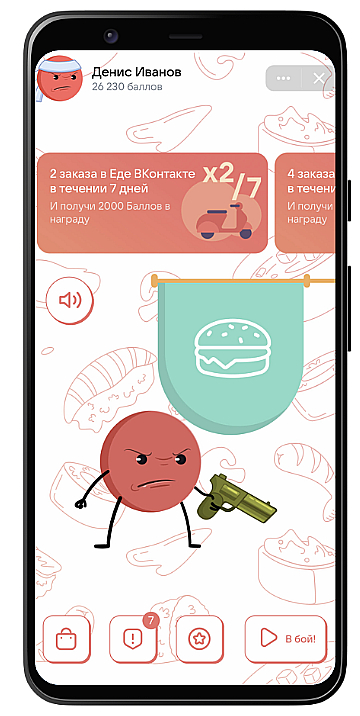 Дополнительные баллы в игре также можно заработать за заказы в сервисе «Еда ВКонтакте». В магазине внутри мини-игры пользователь с помощью баллов может сменить или прокачать аватар, выбрать другой клан (всего доступно четыре клана: пиццы, бургеров, суши, лапши или завтрака), получить промокоды в сервисе «Еда ВКонтакте», новые стикеры и статусы Королевской битвы.