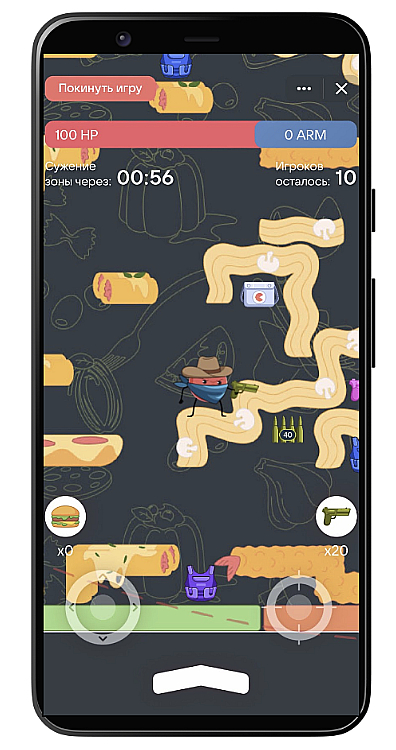 В одной игровой сессии могут участвовать 10 человек, при этом одновременно может происходить несколько битв. Каждому участнику доступна аптечка в виде еды, которая восстанавливает жизненные силы.