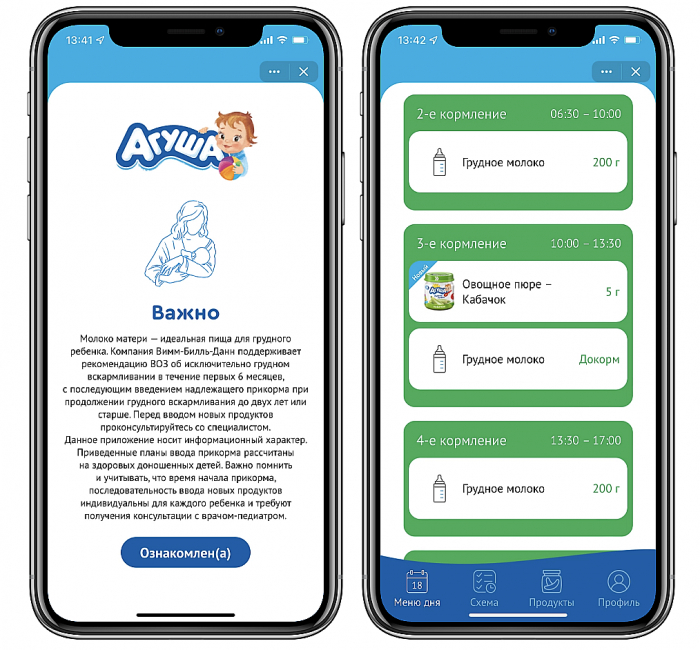 «Календарь прикорма» был разработан совместно с брендом «Агуша» и врачом-педиатром. Все рекомендации и инструкции соответствуют стандартам Всемирной организации здравоохранения и положениям Национальной программы оптимизации вскармливания детей первого года жизни.