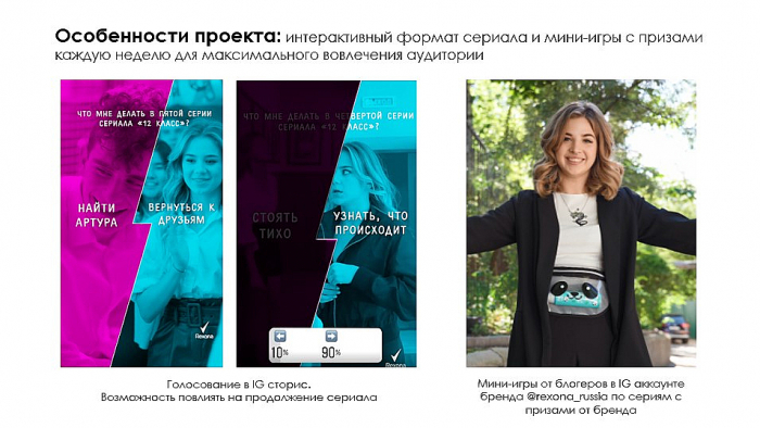 На протяжении всей кампании инфлюенсеры анонсировали интересные вовлекающие мини-игры: квесты, конкурсы и другие активности на тему вышедших серий с розыгрышем призов — стильных прозрачных поясных сумок с новым продуктом Rexona.