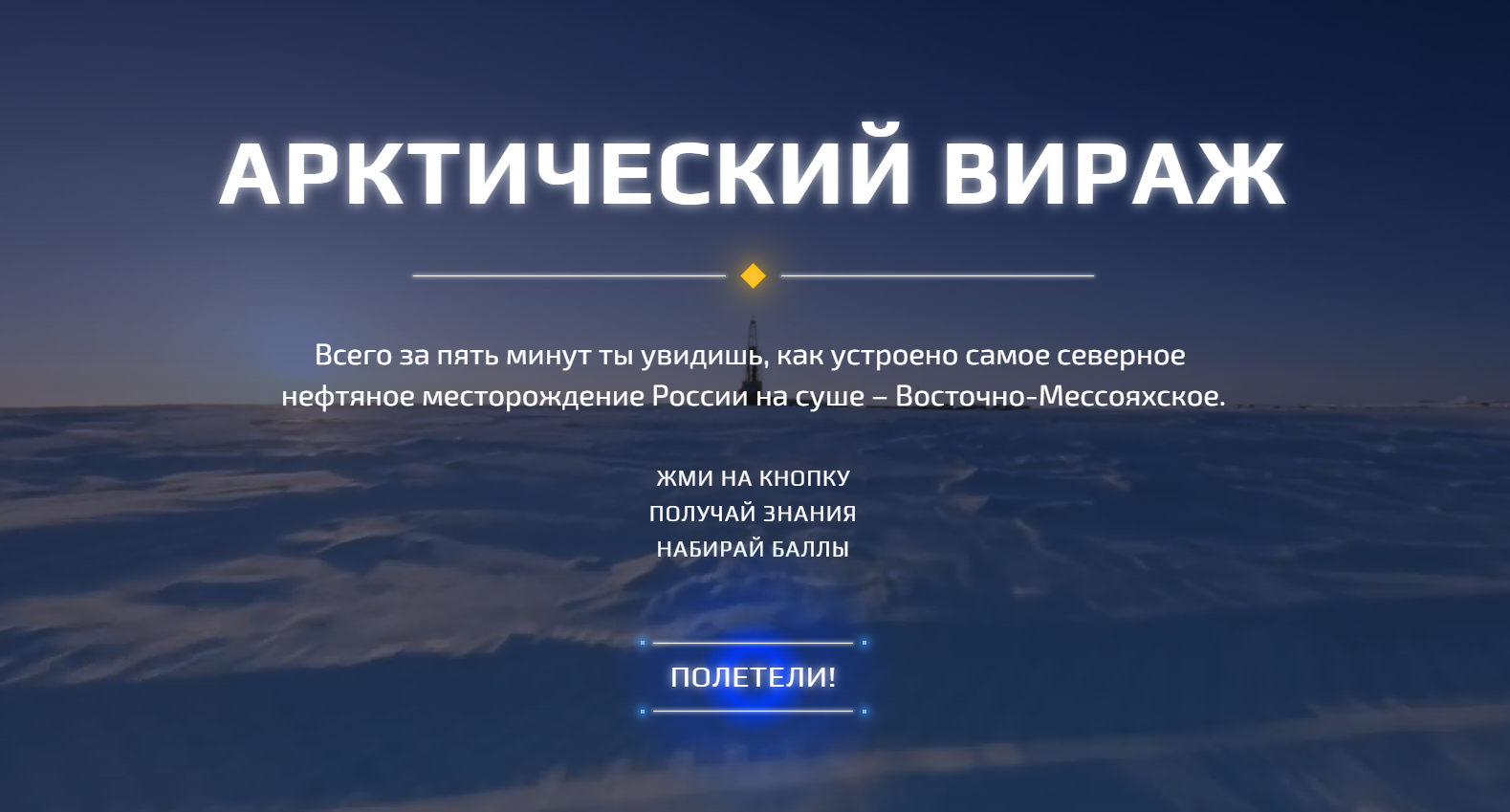 Увидеть самое северное материковое нефтяное месторождение России и… изучить его. Теперь это возможно благодаря спецпроекту-гигараме «Арктический вираж». Не выходя из дома вы сможете облететь бескрайнюю тундру, забраться на вышку Восточно-Мессояхского месторождения, посетить лаборатории и узнать, когда и как здесь сформировались громадные запасы нефти и какие передовые технологии нужны для ее добычи.