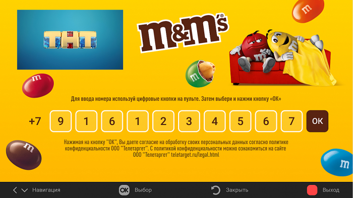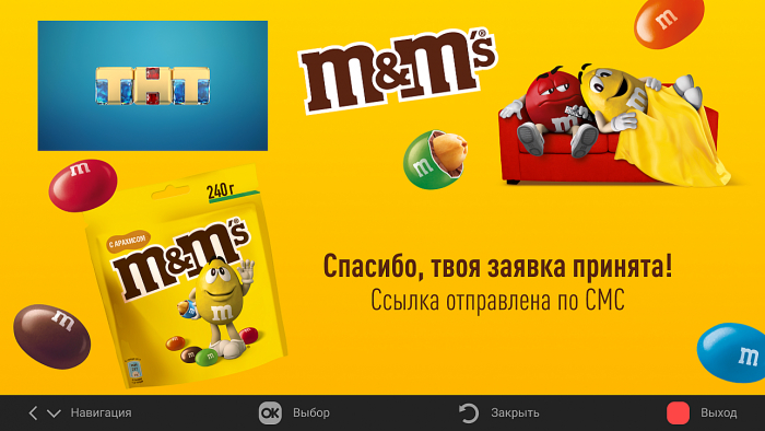 Сейлз-хаус «Газпром-медиа» совместно с агентством Mediacom запустили интерактивную кампанию на HbbTV и IPTV на телеканале ТНТ. Задачами размещения было проведение рекламной кампании c целью создания привычки потребления драже M&M’s перед экраном, а также привлечение аудитории на сайты магазинов онлайн-доставки для покупки продукции бренда с целью увеличения CTR и CR. Размещение было в линейках сериалов и юмористических программах. Во время просмотра на экране появлялся информер. Нажав кнопку или отсканировав QR-код, зритель мог заказать M&M’s со скидкой.