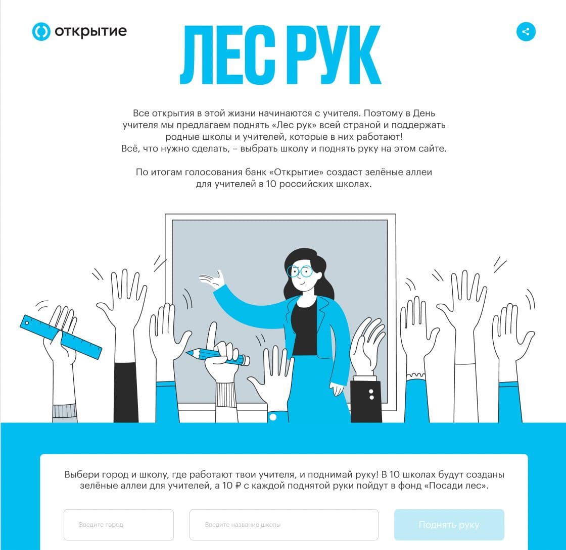 Банк «Открытие» запустил проект «Лес рук», приуроченный ко Дню учителя. Чтобы поучаствовать в нём, пользователям достаточно было просто «поднять руку» на сайте и не бояться, что вызовут к доске — ведь именно так участники могли отправить добрые пожелания педагогам.