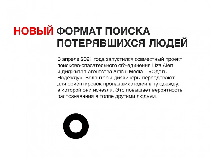 «Лиза Алерт» и агентство Articul Media запустили проект «Одеть надежду», который помогает в поиске людей. Дизайнеры «переодевают» пропавших людей на фотографиях, чтобы они лучше соответствовали ориентировкам — это повышает шансы найти человека, рассказали Sostav авторы проекта.