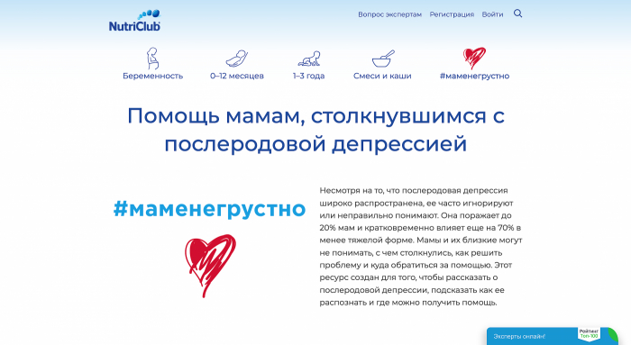 3. Запустили движение #маменегрустно, чтобы рассказать о послеродовой депрессии (ПРД) — проблеме, о которой не принято говорить. Для этого мы создали отдельную страницу на сайте бренда с информацией о ПРД.