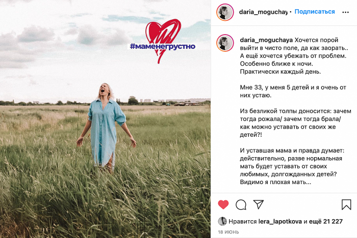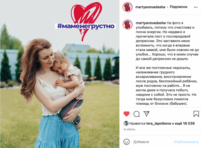 Нашей целью было объяснить, что иногда мамы сталкиваются с нечто большим, чем просто грусть, и что такие состояния требуют особого внимания. Мы рассказали о послеродовой депрессии и где искать помощь, если человек столкнулся с проблемой. Блогеры в Instagram поделились историями о ПРД, оставили ссылку на сайт и призвали участвовать в движении.