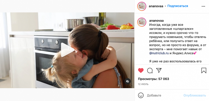 1. Мы создали навык Яндекс.Алисы — она даёт ответы на вопросы об уходе за ребёнком и не только от экспертов NutriClub. Блогеры в Instagram рассказали, как получать ответы с помощью Алисы, даже когда руки заняты.