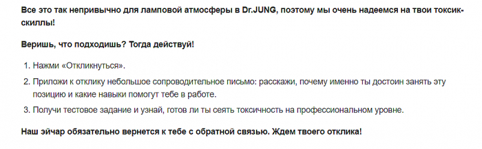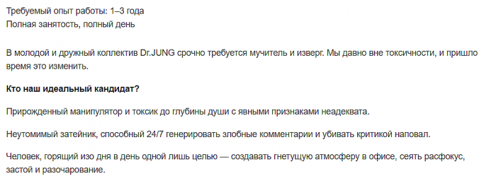 Директор по токсичности был принят в штат Dr.JUNG — всё началось в начале ноября 2021 года, когда агентство опубликовало «вакансию мечты». В обязанности кандидата входило: сеять расфокус и разочарование, разжигать агонию в глазах и генерировать правки ради правок. Как отметили креаторы, в рекордные сроки в индустрии нашлось много соискателей на должность.