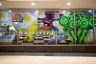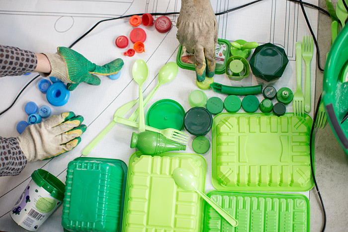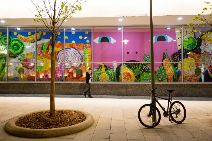 Авторы панно перебрали около 4 тонн очищенного пластикового мусора – в инсталляции использованы более 340 кг упаковок от товаров, лотков для готовой еды, детских игрушек и других предметов. Сюжет в стиле поп-арт совместил в себе множество образов и паттернов, характерных для ритейла: фрукты и овощи, еда и кусающие ее рты, столовые приборы, авоськи и тележка.