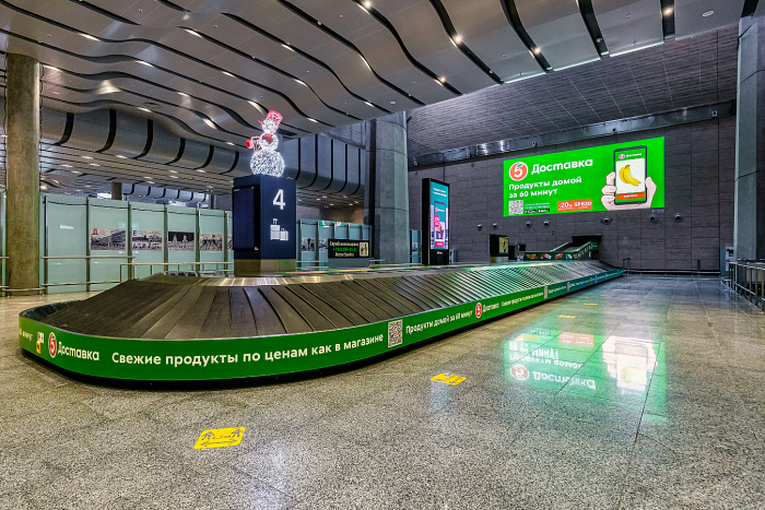 Помимо «летающей» рекламной конструкции, «Пятерочка» установила свои баннеры в залах ожидания и забрендировала ленту выдачи багажа.