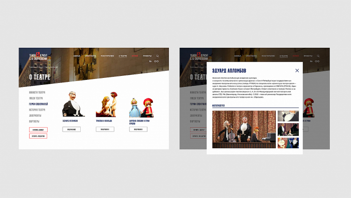 В выбранной клиентом версии сайта команда сохранила основные визуальные атрибуты театра в шапках разделов: фото часов, зрительного зала, кукол из музея, фасад здания и другие. Благодаря новой концепции на сервисе появилась возможность покупать билеты не только на спектакли, но и на экскурсии в музей и мемориальную квартиру Сергея Владимировича Образцова, а также заказывать групповые экскурсии для взрослых и детей.