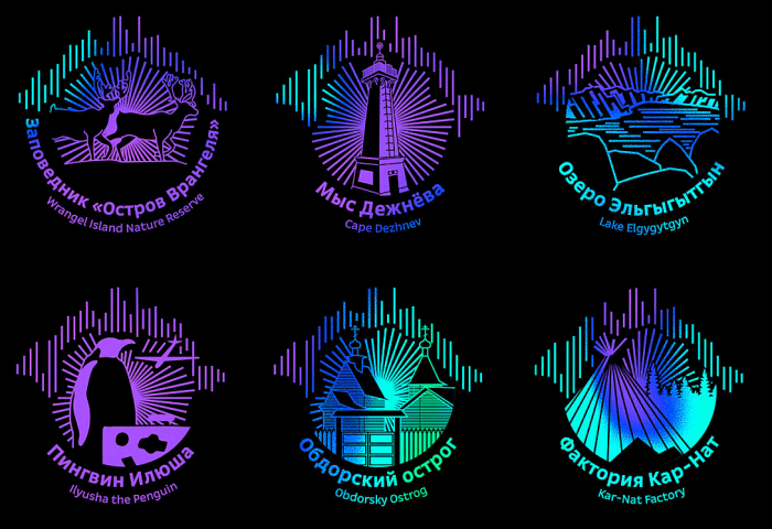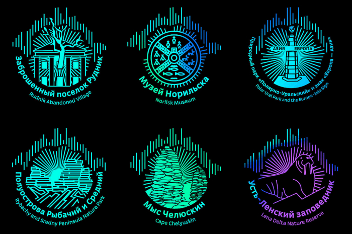 При посещении перечисленных достопримечательностей Арктики на страницах паспорта будут проставлены печати с изображениями ключевых северных символов — среди них можно встретить мамонта, ледокол «Красин» и село Териберка. Для туристических штампов креаторы придумали эмблему северного сияния — с неоновыми волнами и линиями на фоне леса.