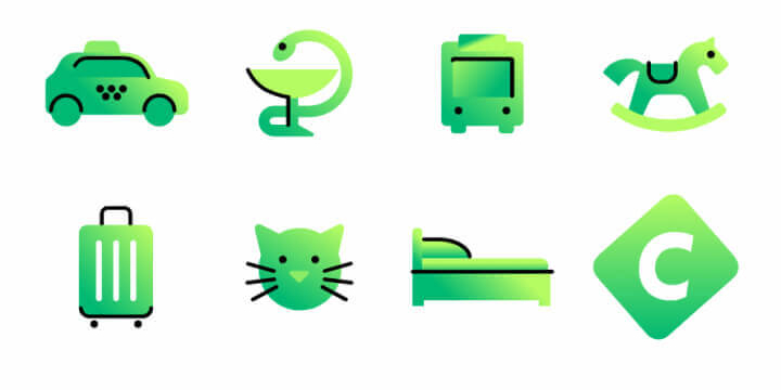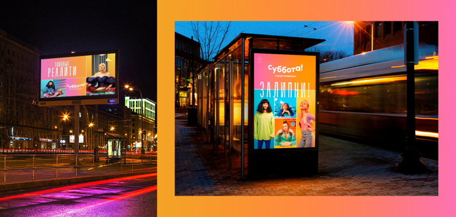 Основной цветовой прием «Субботы!» — градиент. В качестве главных фирменных цветов креаторы выбрали оттенки маджента и оранжа, дополнительных — голубого, лилового и салатового.