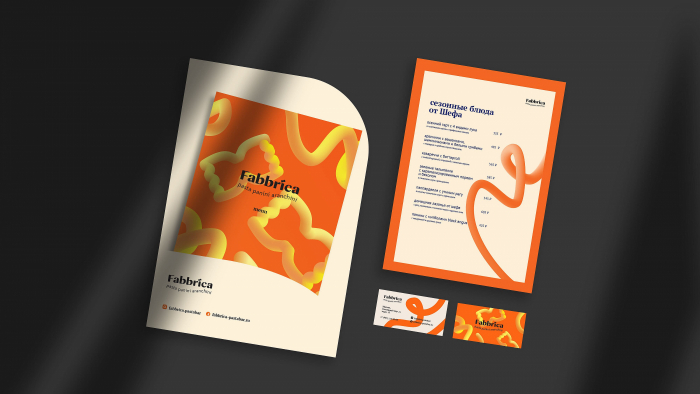В основе айдентики лежат объемные графические элементы, олицетворяющие пасту различных видов и размеров и приправленные аппетитными фразами. Во главу цветовой палитры встали насыщенный оранжевый, кремовый и графитовый серый. При создании обновлённого образа «Fabbrica» дизайнеры вдохновлялись итальянской кухней, эмоциональностью и открытостью итальянцев, а также существующим интерьером ресторана.