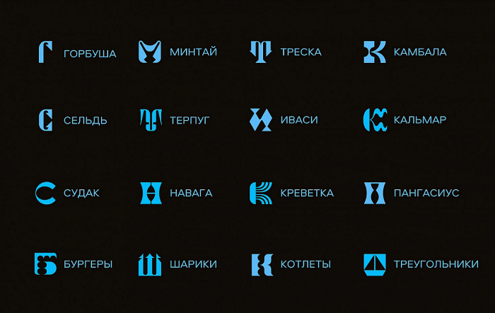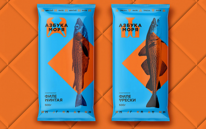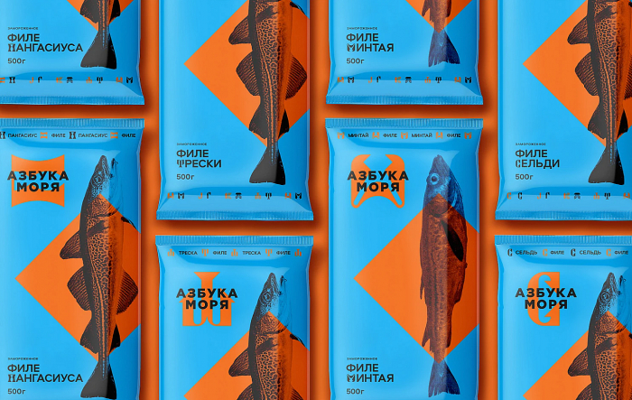 Новый дизайн требовался для нескольких форматов: пакет, коробка и наклейка-стикер. Команда агентство предложила яркое оранжево-голубое цветовое сочетание и свой алфавит: для каждой рыбы или полуфабриката была разработана буква-знак – первая буква названия, навеянная морскими образами.