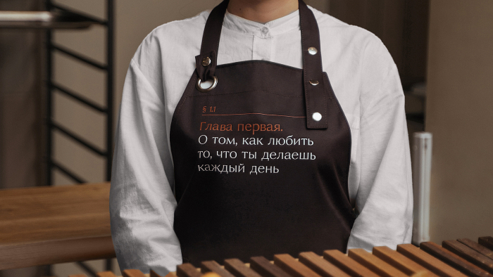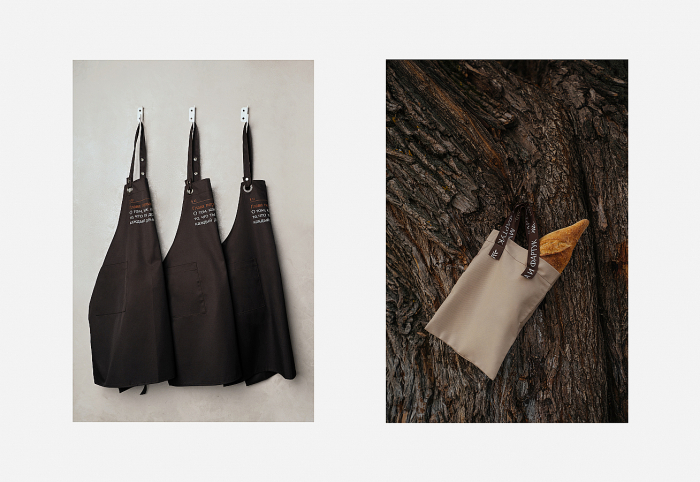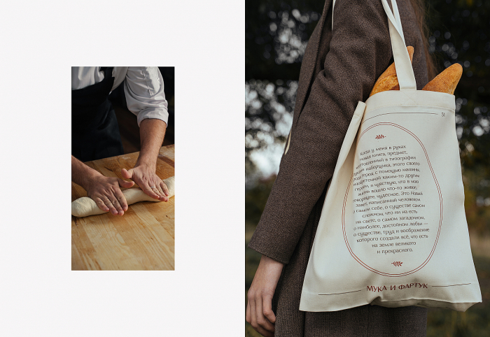 Основа креативной концепции кафе-пекарни «Мука и Фартук», предложенной агентством — воспоминания, связанные с хлебом. Вербальная часть стала ключевой на проекте. На её основе, отталкиваясь от идеи, разработали логотип и фирменный стиль. Айдентика кафе содержит в себе элементы книжной культуры — страницы, колонтитулы, параграфы.