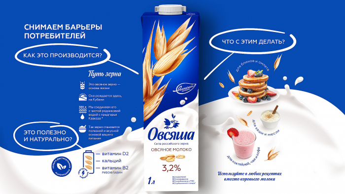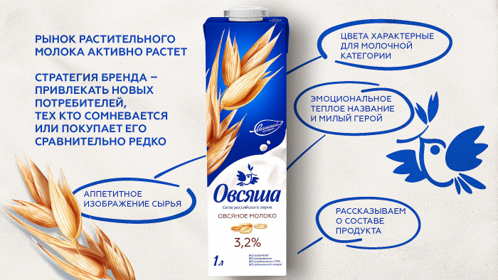 Резкий рост сегмента растительных напитков на рынке привёл компанию к пониманию необходимости создания собственного бренда растительного молока, чтобы занять свою нишу в этом сегменте. Название для продукта было разработано агентством и выбрано по результатам тестирования на потенциальных потребителях: «Овсяша» — эмоциональный, ласковый нейм, который между тем может воплощать в себе энергичный и уверенный характер бренда.