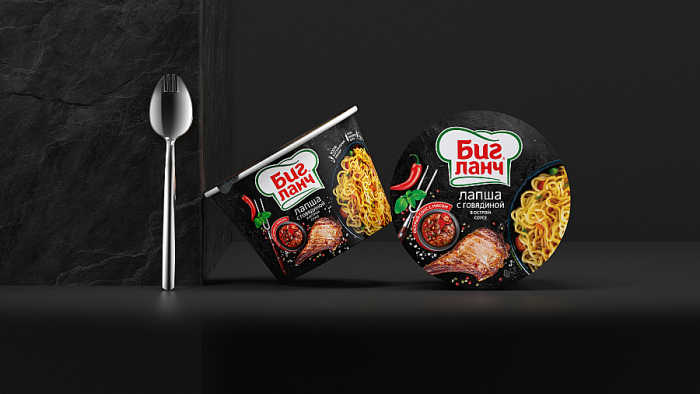 Было важно, чтобы упаковка, независимо от огрехов мерчендайзеров, работала на увеличение продаж на полке. Сотрудники супермаркетов не всегда ровно выкладывают лапшу и пюре в круглой упаковке. Исключить это удалось за счёт отработки боковин.