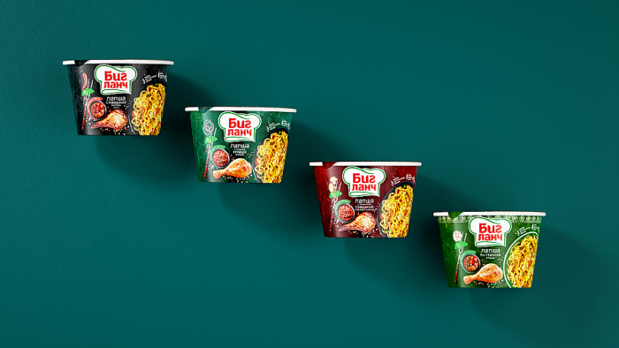 До редизайна «Биг Ланч» с разными ингредиентами было не так легко идентифицировать на полке. Они отличались лишь цветом логотипа и плашек. Улучшить клиентский опыт и чётко разграничить линейку товаров «Биг Ланч» помогли фоновые цвета каменной доски на новых упаковках.