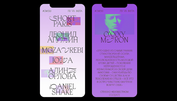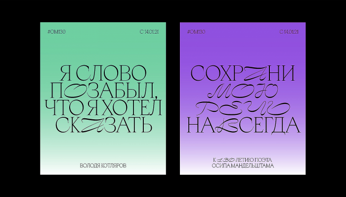 Сочетание этих шрифтов образует переплетение исторических и рукописных форм, переосмысленных в современном контексте. Оно отражает суть проекта OM130 — поэзию Мандельштама, транслируемую через оптику современных музыкантов.