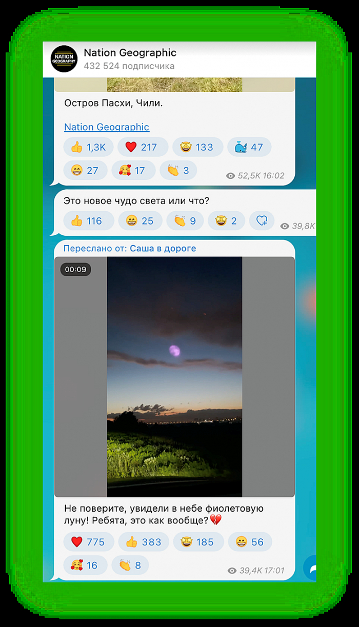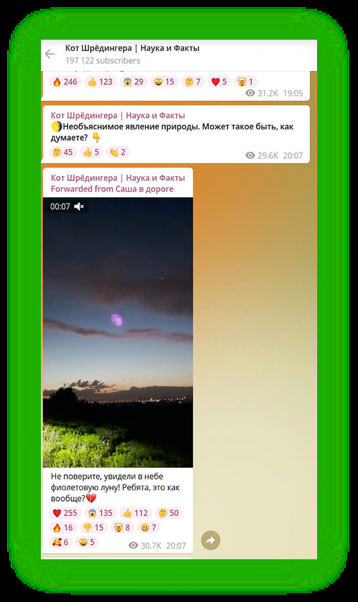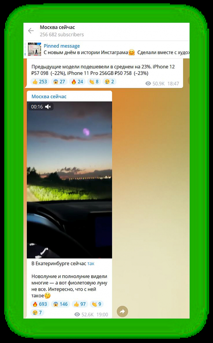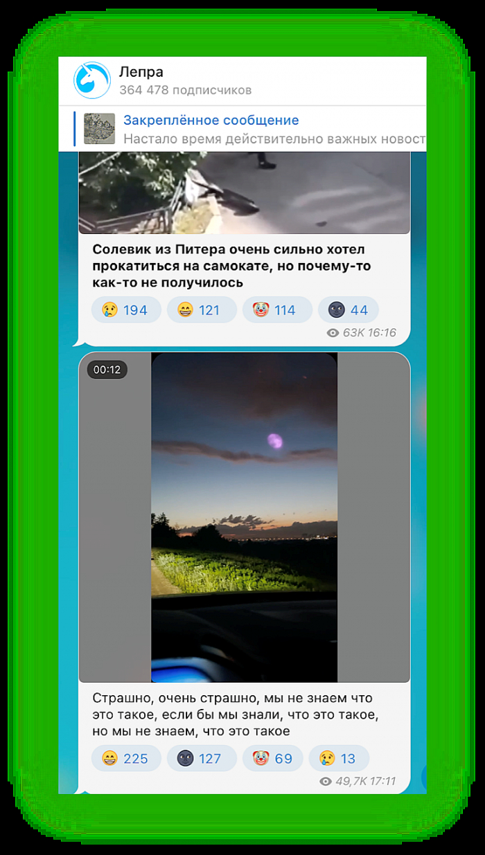 Далее в течение 3-4 дней это видео вышло в нескольких новостных и развлекательных телеграм-каналах. Под каждый пост были придуманы разные тексты в стилистике пабликов: