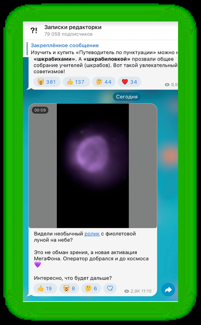 По мере набора роликом охвата уже небольшие и локальные паблики стали репостить видео, а пользователи – делиться им в личных сообщениях. За неделю видео с загадочной фиолетовой Луной репостнули в личные сообщения 11 тыс. раз – аудитория подхватила интригу и делилась увиденным с друзьями.