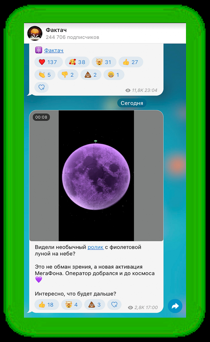 На старте активации в интернете появилось загадочное вирусное видео с необычной Луной фиолетового цвета без какого-либо упоминания бренда. Специально для этого был создан Telegram-канал вымышленного блогера-путешественника, который и поделился роликом.