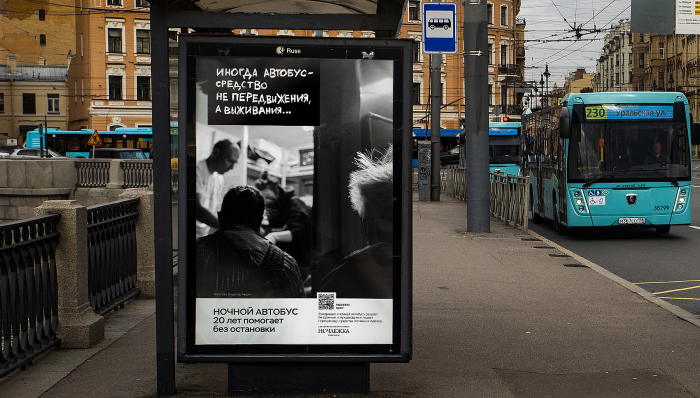 На автобусных остановках Петербурга появились необычные баннеры. Пассажирам они рассказали об автобусе, который выезжает в рейс, чтобы спасать жизни бездомных людей.
