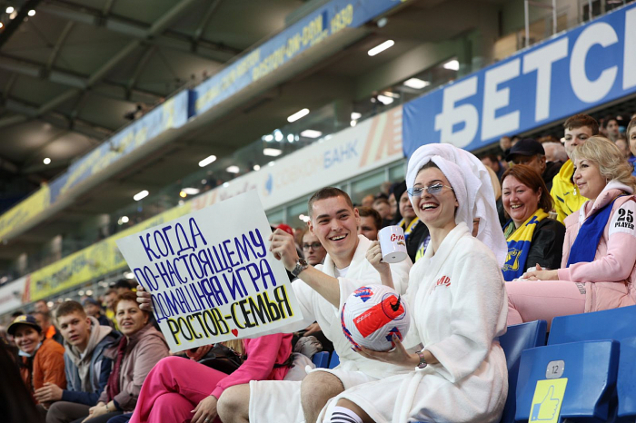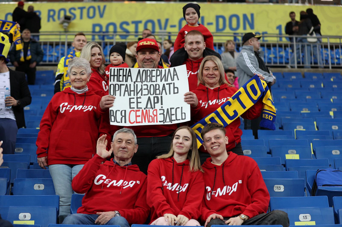 «Так и надо болеть за свою команду, всей семьёй! Берите пример», — уточнил во время игры комментатор «Матч ТВ», когда оператор крупным планом показал две семьи среди болельщиков в цветах «Ростова».