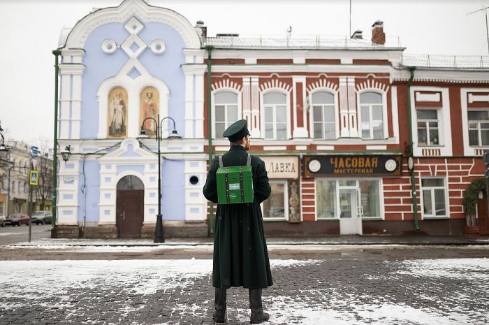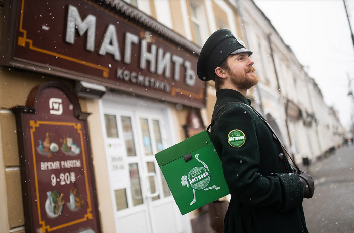 Чтобы поддержать инициативу администрации Рыбинска, креаторы нашли несколько курьеров в Рыбинск, переодели их в ретро-форму, выдали шинель, фуражку и перчатки. Зелёный рюкзак заменили на короб с кожаными ремешками и логотипом в дореволюционном стиле, и провели атмосферную съемку на улицах города.
