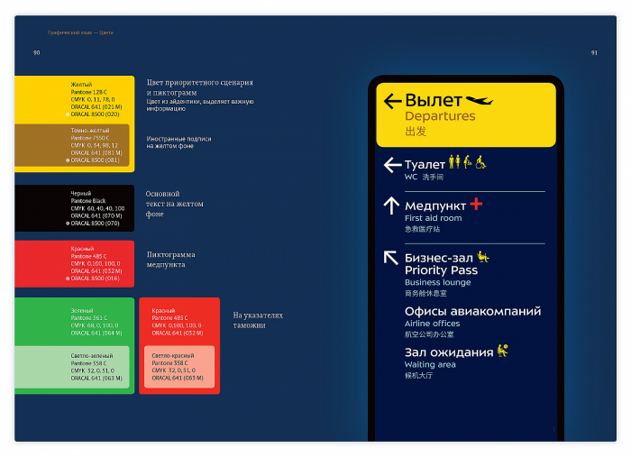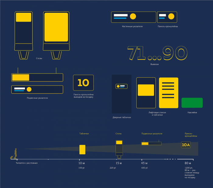 Фирменный синий цвет отличает навигацию от рекламы. Приоритетная информация выделяется жёлтой плашкой и крупным кеглем, остальные данные группируются согласно направлению движения. Расположение конструкций учитывает пассажиропоток: большие стелы не преграждают путь и размещаются так, чтобы человек мог ознакомиться с ними, находясь на эскалаторе.