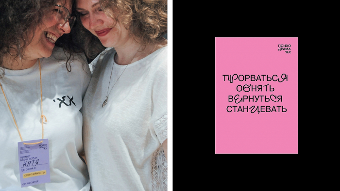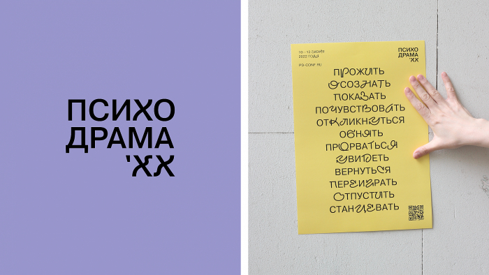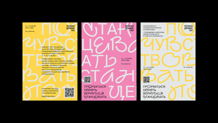 Основа фирменного стиля — фразы и работа с типографикой. Психодрама — это действие души. Действие — это глаголы. Множество глаголов-слоганов, которые описывают душевные трансформации, происходящие во время сеансов.