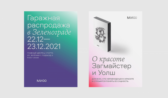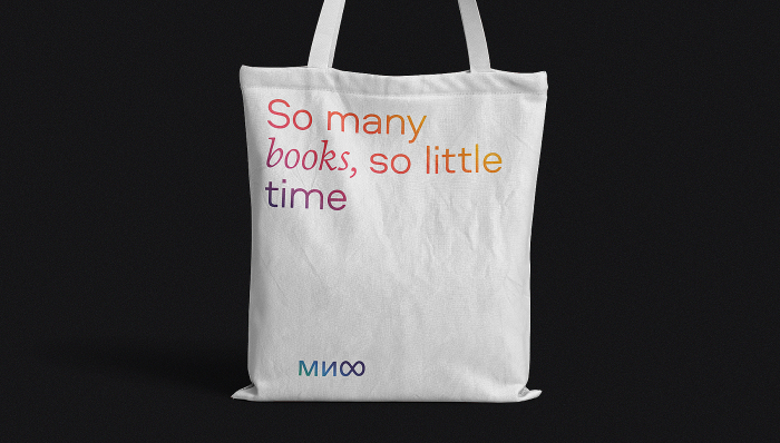 В основе новой айдентики МИФ — метафора непрекращающихся перемен и безграничного знания. Раскрывая идею разными средствами, элементы стиля формируют цельную образную систему. В логотипе — крупные прописные; вместо Ф — знак бесконечности, самостоятельно используемый, как знак.