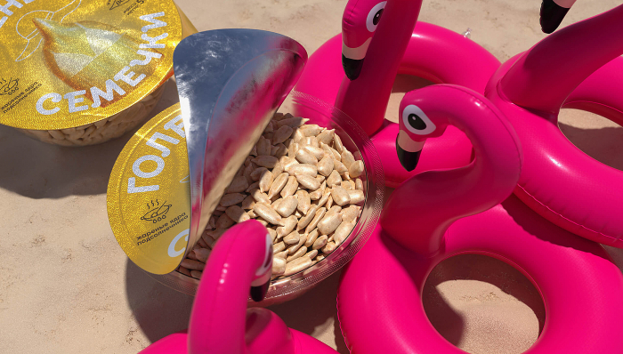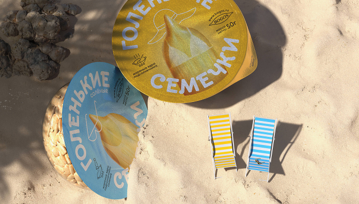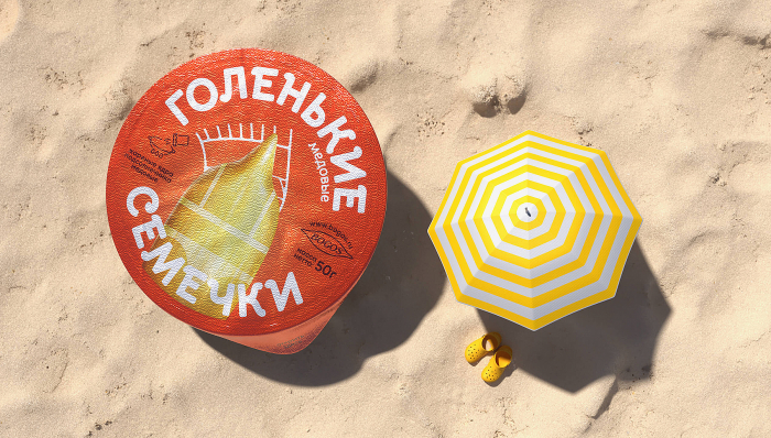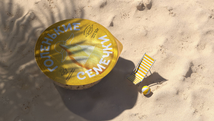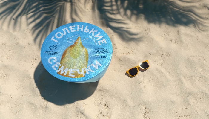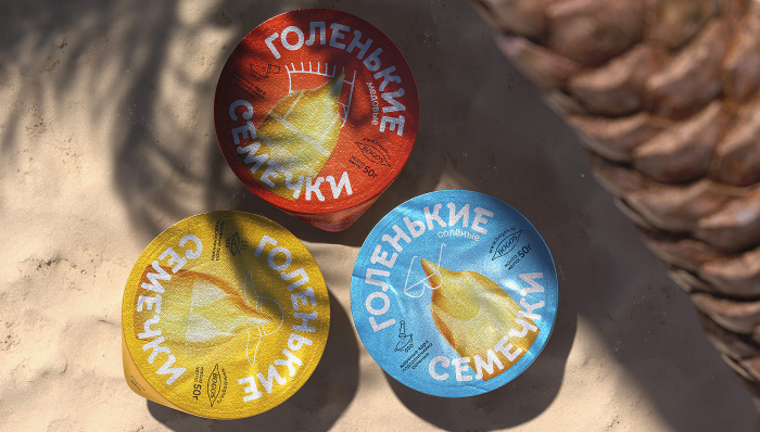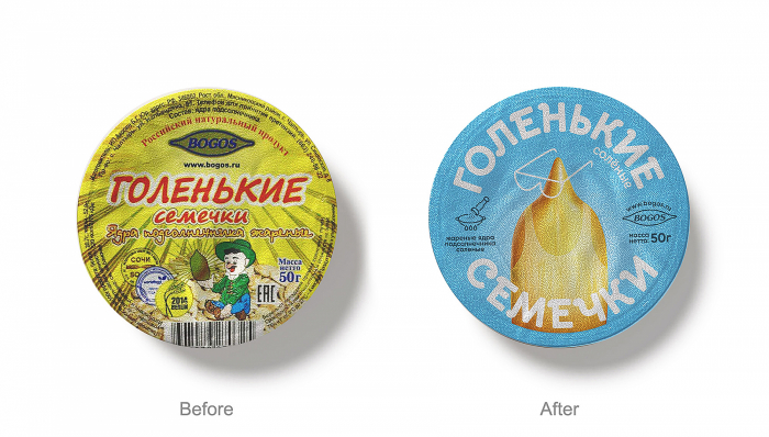 Да, это по-настоящему голенькие семечки! Никто не шутит. И раз все так серьезно, нужен был по-настоящему убедительный дизайн, эмоционально раскрывающий индивидуальность продукта. Именно поэтому мы подошли к вопросу с юмором! Важным критерием было остаться в тех же технических возможностях производства упаковки, но сделать ее более привлекательной, лучше показать продукт.