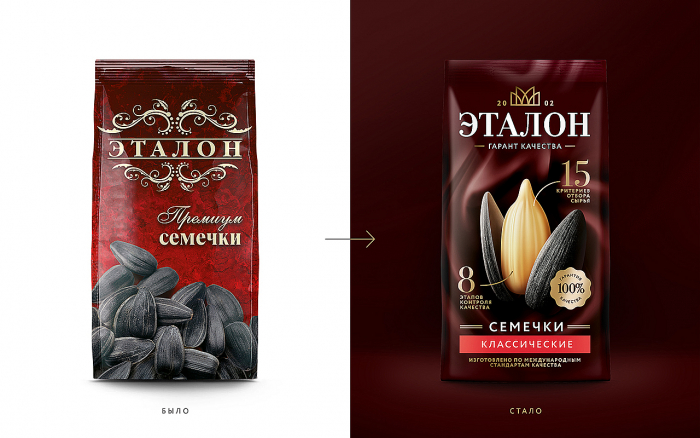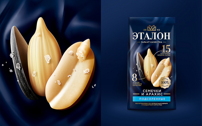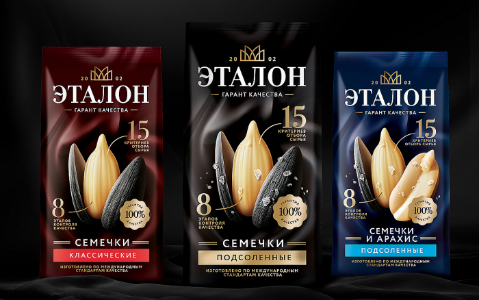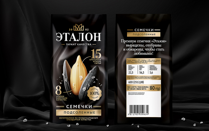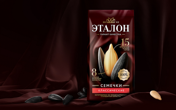 Новая упаковка содержит королевскую фудзону в виде крупной раскрытой золотистой семечки. Надпись «гарант качества» подкрепляется клеймами «15 критериев отбора сырья», «8 этапов контроля качества», говорящими про ответственность производителя. В коммуникациях сделан акцент на том, что семечки «Эталон» «выращены, отобраны и обжарены, чтобы стать любимыми».