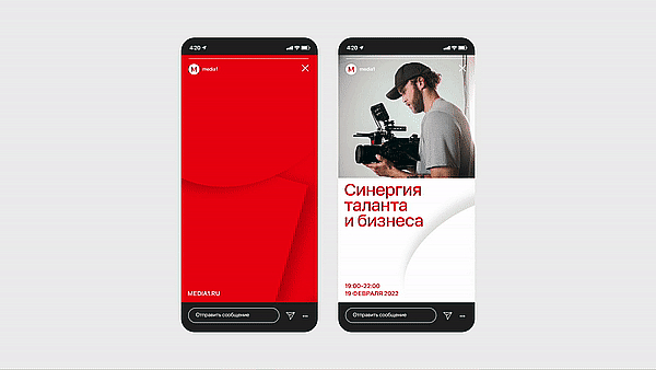 Новое позиционирование «Медиа1» дизайнеры облекли в визуальную метафору галереи современного искусства, где выставляются перспективные активы холдинга — пять геометрических фигур, в коллаборации и пересечениях которых рождаются те самые идеи. Сущности дополняют друг друга, расставляют акценты на макетах или становятся контейнерами для контента, каждый раз меняя картинку, как команда «Медиа1» старается менять индустрию.