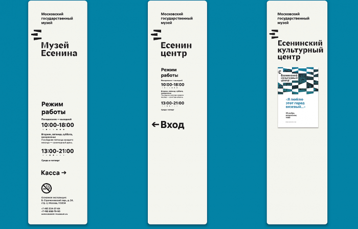Простой на вид знак из трех черточек заключает множество образов — это и полоски на березах, и угол избы, сложенный «ласточкиным хвостом», и три строчки стиха, и кирпичная кладка, отсылающая к теме города в стихах Есенина. Цвета символизируют разные аспекты творчества поэта и помогают визуально различать музей и культурные центры: золотистый ассоциируется с осенью, красный — мотив города, революции и имажинистского авангарда, синий — цвет высокого неба и глаз самого Есенина. Выполненная в едином стиле навигация для подразделений без проблем превращается из стел в таблички.