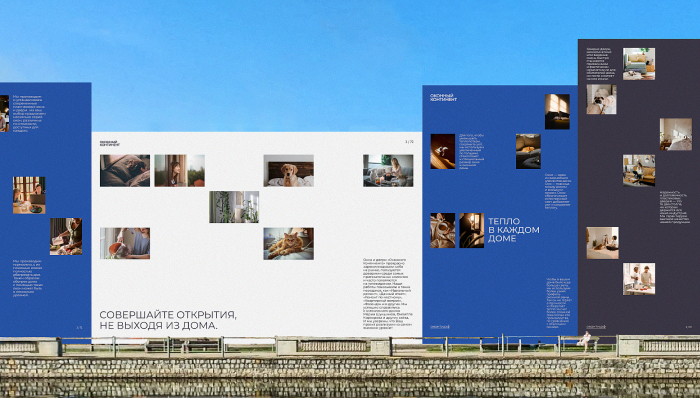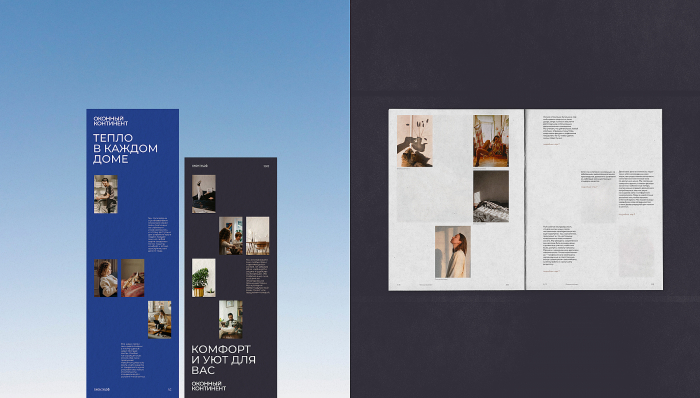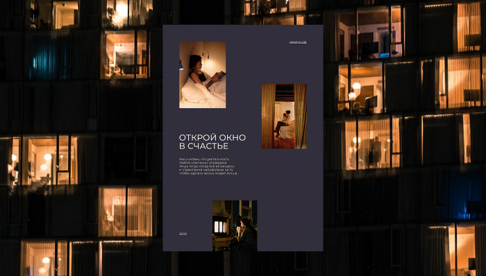 Новый знак компании — прямоугольник, символизирующий окно. В нём CreativePeople сохранили визуальную метафору континента с помощью цветов – голубого, обозначающего океан и зелёного, обозначающего континент на карте. Этот же прямоугольник стал основным стилеобразующим элементом, в сочетании с тёплым фотостилем и новым в палитре оранжевым цветом он позволил создать на макетах узнаваемый паттерн светящихся окон многоэтажек. Это формирует узоры и фигуры, которые становятся самостоятельными элементами коммуникации бренда.