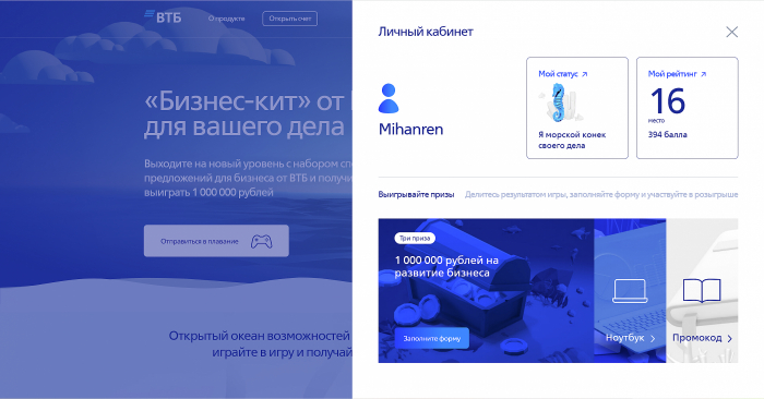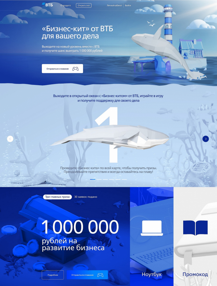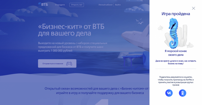 Игрокам предстояло отбиться от рыб-прилипал (комиссии за переводы и платежи), доплыть до выгодного маяка (пакет услуг от ВТБ со скидкой) или уютной гавани, где обитают рыбы-юристы, крабы-аудиторы и даже скаты-айтишники. Среди пользователей разыгрывались не только ноутбуки и промокоды, но и три главных приза по 1 млн рублей, которые получают 3 участника, предложившие лучшую дополнительную меру поддержки. За полтора месяца на лендинг с игрой перешли более 370 тыс. раз, а 34 тыс. человек приняли участие в игре.