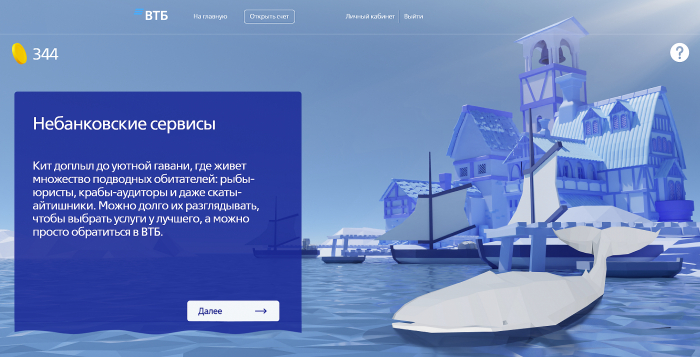 ВТБ разработал интерактивную игру и конкурс для предпринимателей. Целью спецпроекта являлось повышение осведомленности о мерах поддержки для бизнеса от ВТБ. Бизнес-кит – главный персонаж - помогал участникам бороздить «океан возможностей», собирать кит-койны и максимально нетривиально узнавать полезную информацию.