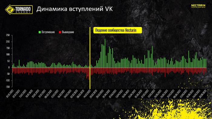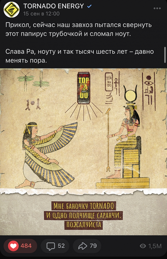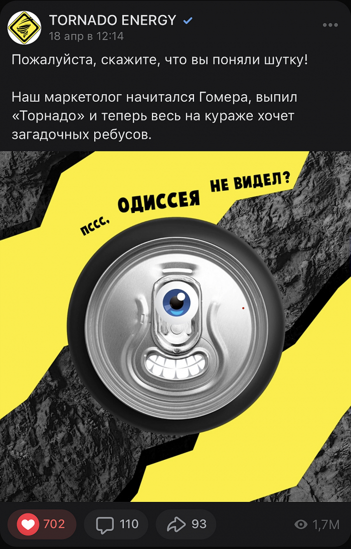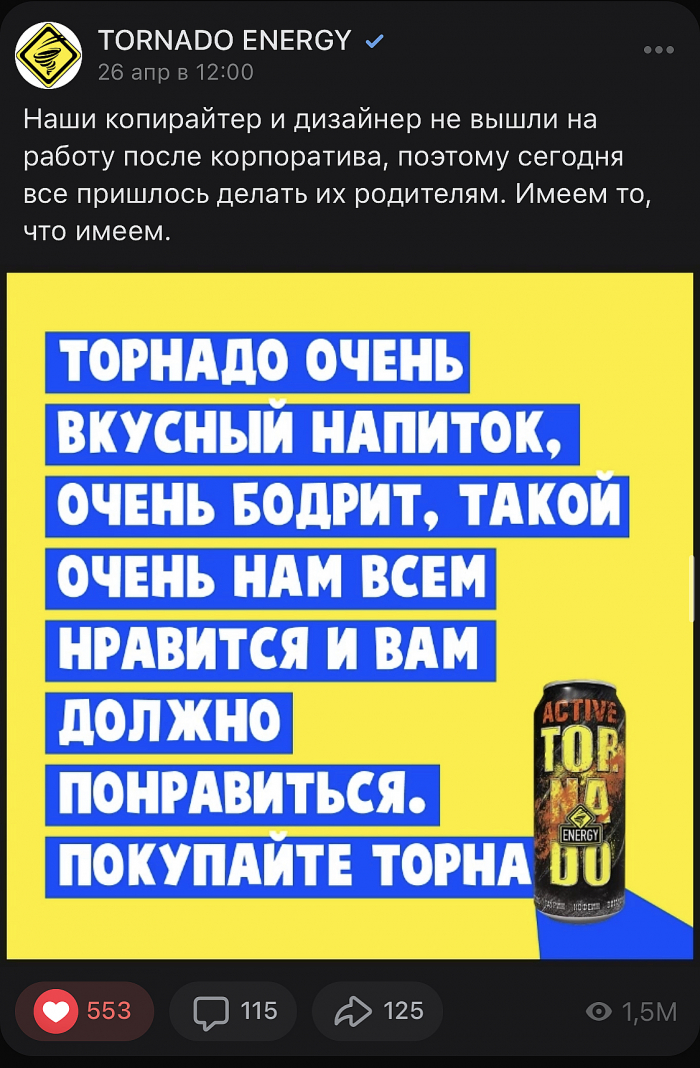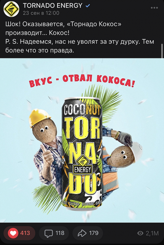 Tornado – первое SMM-сообщество во «ВКонтакте» в жанре ситком. По легенде, к постам прикладывают руку самые неожиданные работники бренда Tornado – от уборщика до маркетинг-директора. Благодаря этому в постах происходит вакханалия: то текст напишется на другом языке, то совершенно не в кассу директор решит интегрировать в пост Одиссея или кота.