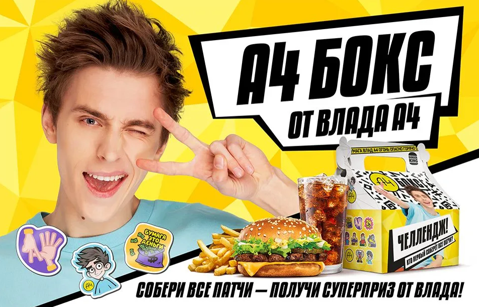 В декабре 2021 года в Burger King впервые появился фирменный Бокс от Влада А4. Внутри именной А4 Бургер, картошка, напиток и один из десяти эксклюзивных патчей. Цель совместного промо: привлечение молодой аудитории, повышение продаж проседающей категории детских обедов. Основной посыл — собери все патчи, участвуй в челлендже и получай крутые призы от Влада.