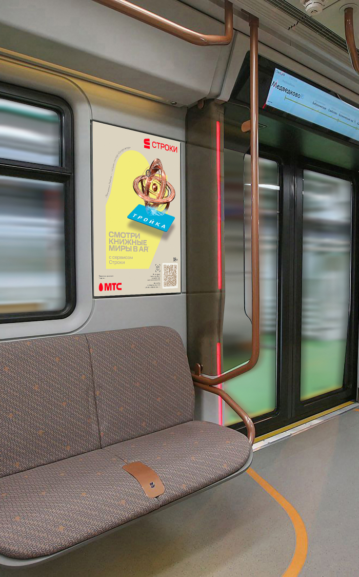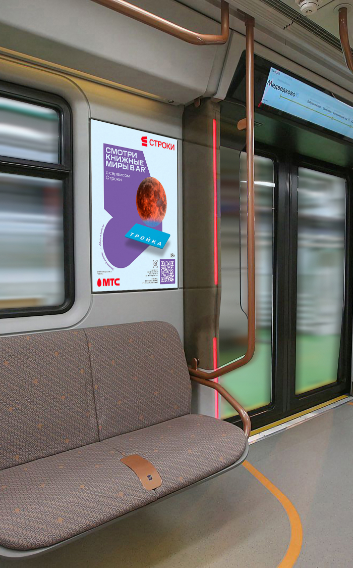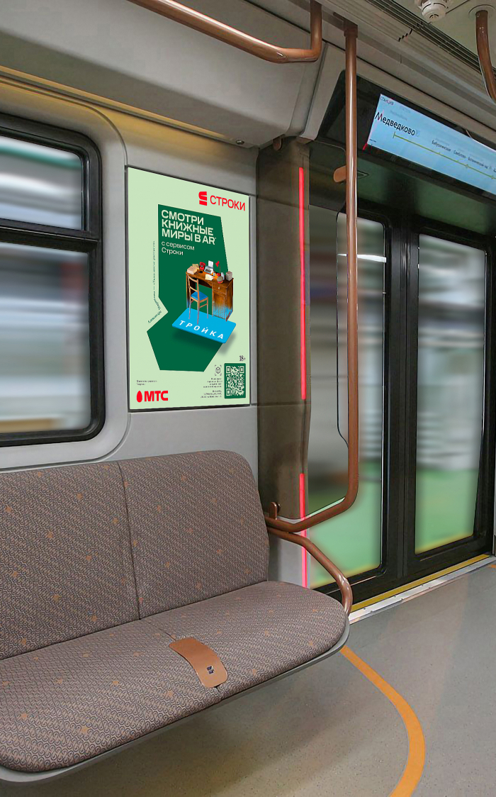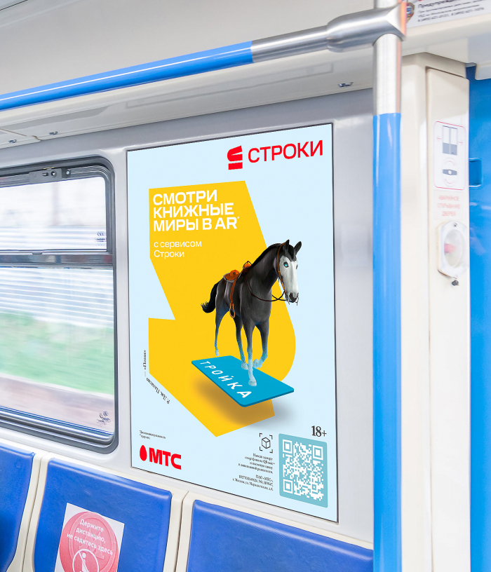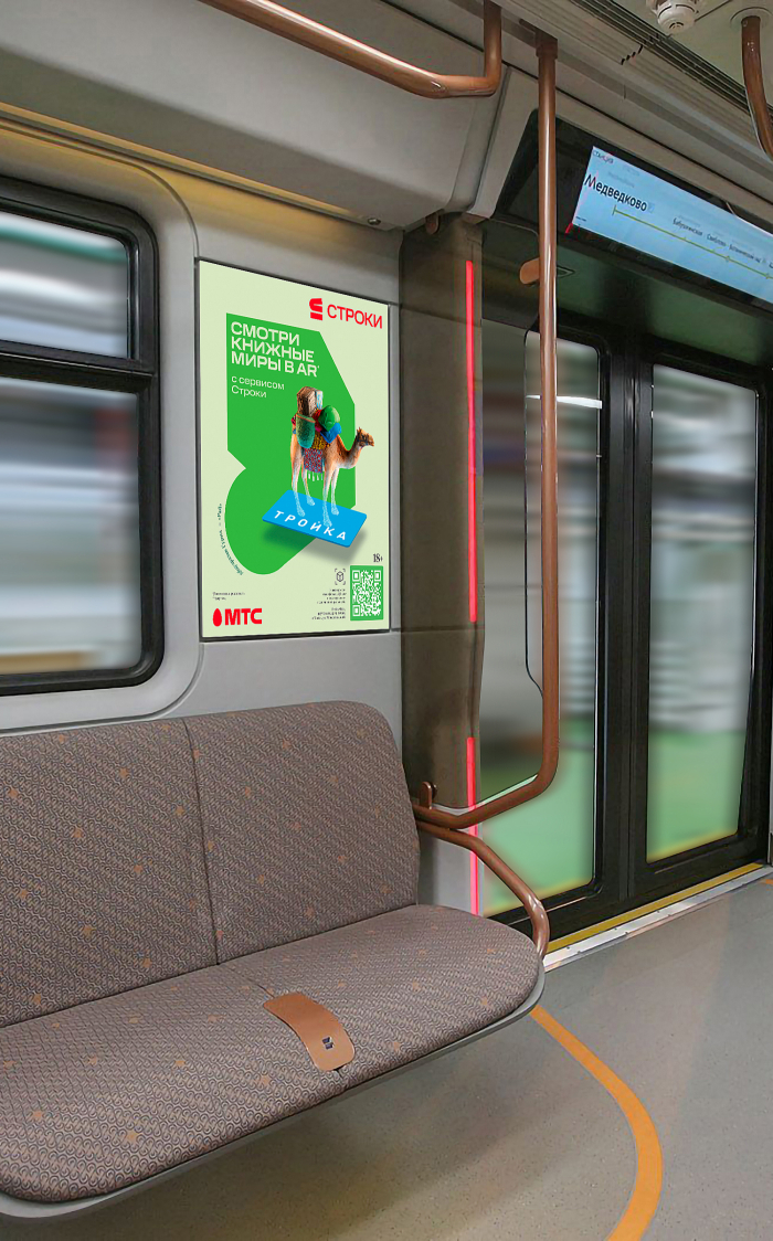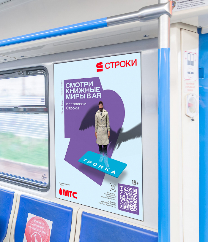 «Оживить» сцены любимых книг с помощью цифровых технологий можно через новый формат рекламы книжного сервиса «Строки» от МТС в вагонах московского метрополитена на всех направлениях. Для этого понадобится смартфон с камерой и карта «Тройка». Необходимо отсканировать QR-код на постере, перейти на лендинг проекта и направить смартфон на лицевую сторону транспортной карты с изображением тройки: буквально на ладони появляется объемный мир известных литературных бестселлеров.