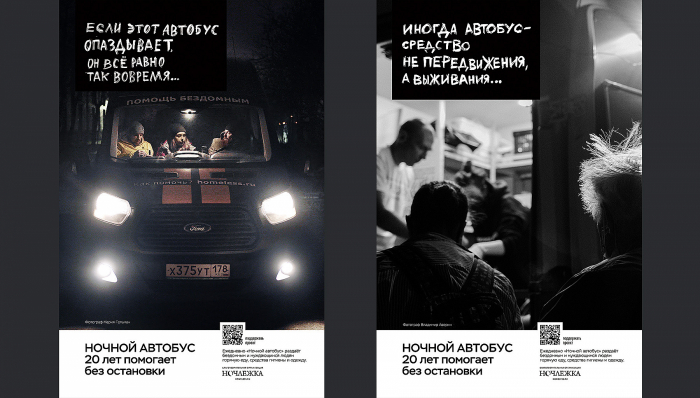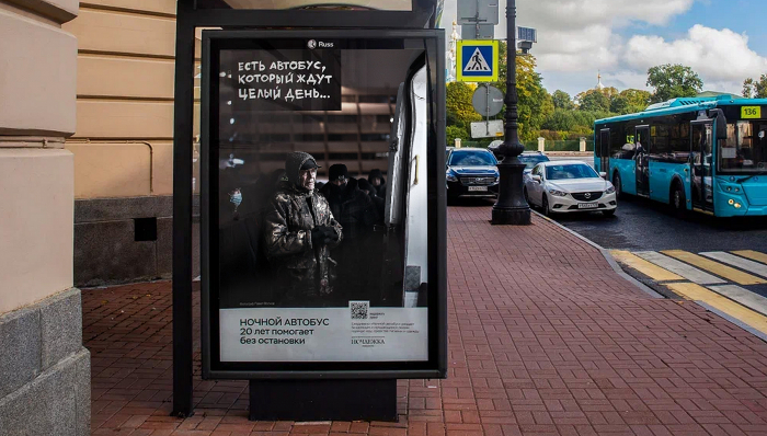 Креативная медиакампания для Ночлежки к юбилею проекта «Ночной автобус» – в этом году ему исполняется 20 лет. На автобусных остановках Петербурга появились необычные баннеры. Пассажирам они рассказали об автобусе, который выезжает в рейс, чтобы спасать жизни бездомных людей.