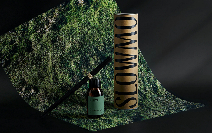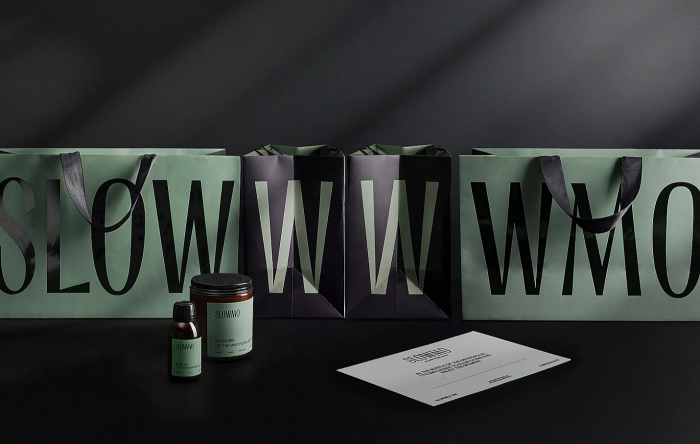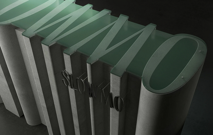 Кроме того, в айдентике важно было выдержать коды премиальности, лаконичности, утончённости. Зелёный оттенок в сочетании с основным чёрным цветом соответствует этим параметрам. Для логотипа SLOWMO был разработан уникальный леттеринг. Это гибкий элемент — буквы шрифта могут трансформироваться, образуя новые архитектурные формы.
