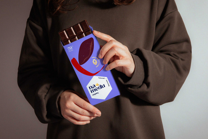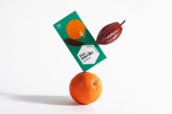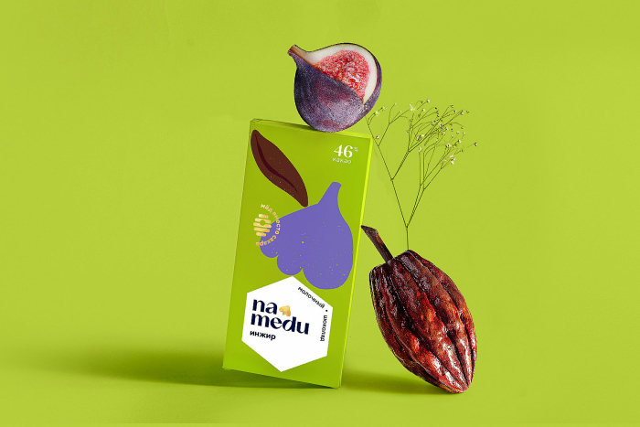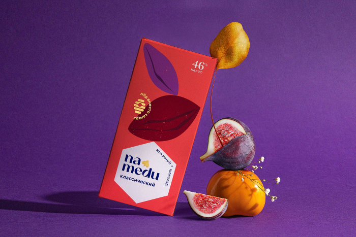 В дизайне нам важно было отразить не «снобский», а открытый и позитивный образ бренда для широкой публики. Название продукта изображено на латинице — Namedu, так как шоколад планируют продавать не только в России, но и поставлять в Китай, Турцию и ОАЭ. Современный контрастный игривый шрифт и лаконичное изображение вылетающей пчелы ненавязчиво отсылает к меду. Более активно «медовые» элементы используются в иллюстрациях на упаковках. Дизайнеры решили буквально визуализировать название на упаковке: упрощенно изобразили соту, а на ней — асимметричные композиции из ингредиентов. На шоколаде без добавок — какао-плоды, на продуктах с другими вкусами с ними соседствуют апельсин, инжир или перец.