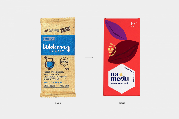«Гагаринские Мануфактуры» производят натуральный шоколад на меду вместо сахара. Изначально шоколад продавался в крафтовой упаковке и не имел выраженной коммуникации, это делало его малозаметным на полке, а разные вкусы было трудно дифференцировать.