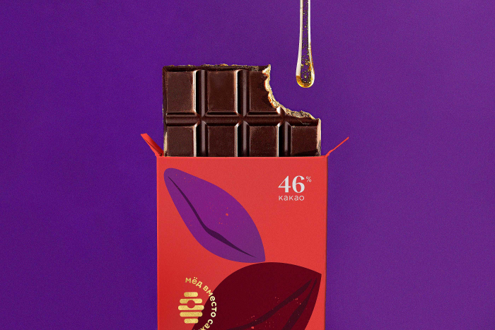 Стиль иллюстрации передает ощущение натуральности, не жертвуя яркостью и заметностью на полке. Также разработали цветовое кодирование, чтобы потребители могли узнать любимый вид шоколада издалека. Знак в виде улья с пояснением «мед вместо сахара» помогает новым покупателям быстро узнать главное преимущество бренда по сравнению с обычным шоколадом.