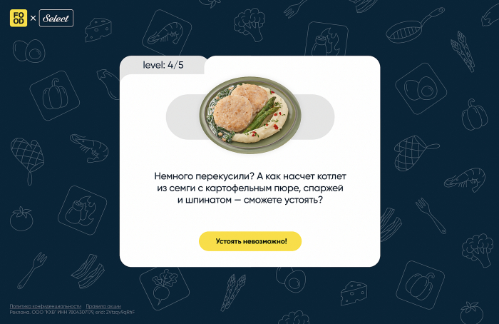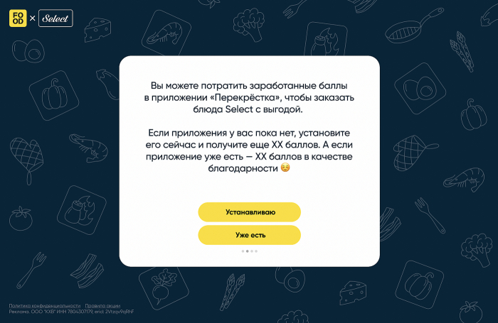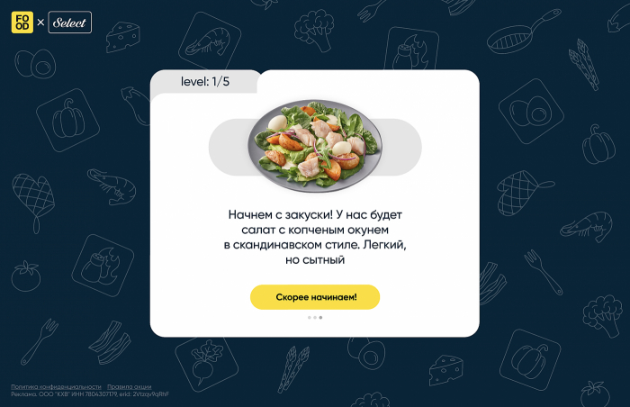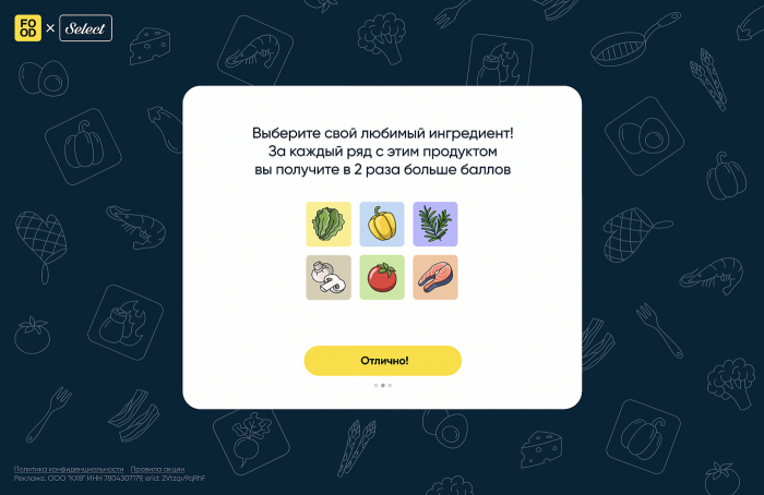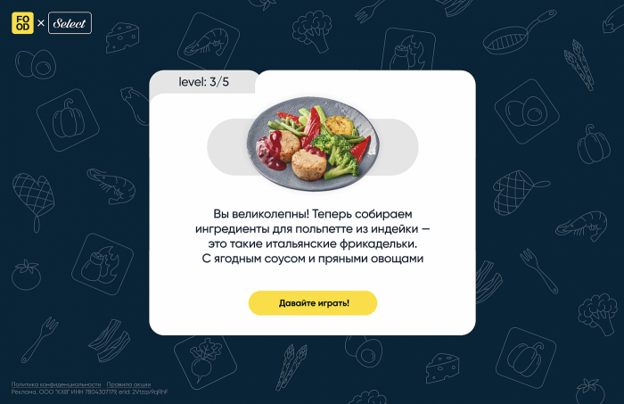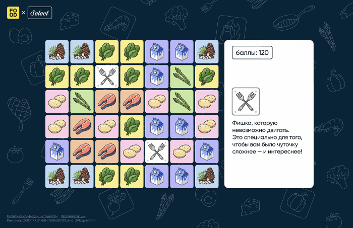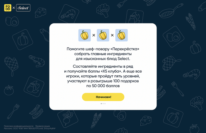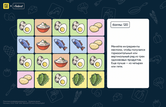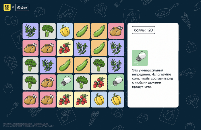 Медиаплатформа о еде Food.ru создала спецпроект по мотивам известной всем игры «Три в ряд» и добилась до 4 000 переходов на установку приложения «Перекресток». Игра была создана, чтобы рассказать о новом продукте «Перекрестка» — блюдах готовой еды премиум-линейки «Шеф Перекресток». Также перед проектом стояли следующие задачи: повысить лояльность аудитории к собственным торговым маркам бренда и увеличить продажи продуктов новой линейки. Для этого команда выбрала игровую механику, которая не только проинформировала пользователей о новом продукте бренда, но и увлекла их простым форматом и вызвала чувство ностальгии. Пользователи собирали ряды с одинаковыми продуктами. Чем больше продуктов в ряду, тем больше баллов получал игрок. За подборку одинаковых «любимых ингредиентов», которые выбирались в начале игры, количество баллов удваивалось. Игра была поделена на пять уровней: чем выше ступень, тем сложнее блюдо, ингредиенты которого нужно было собирать. И тем больше игровое поле и ингредиентов-фишек. Перед каждым этапом игрокам высвечивался экран с подробным рецептом, а также информация о готовой еде из новой линейки бренда.