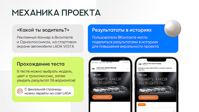 Механика: Пользователю предлагалось узнать, какой он водитель? В тесте можно выбрать модель, цвет и трансмиссию, затем увидеть результат (всего 16 вариантов). Пользователи «ВКонтакте» могли поделиться результатами в историях для повышения виральности проекта.